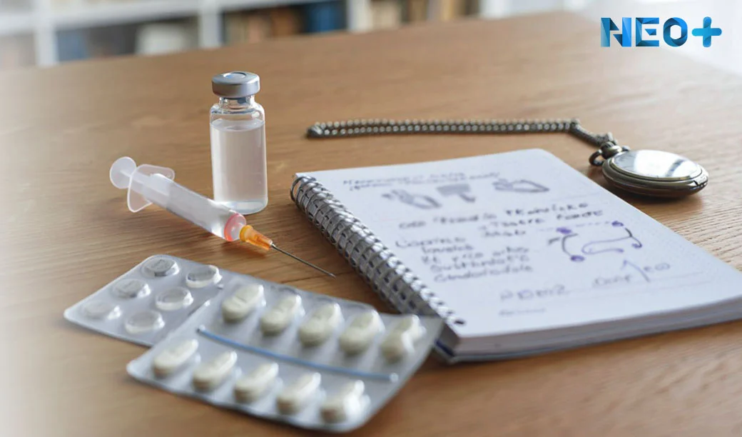 Стол с лекарствами и блокнотом